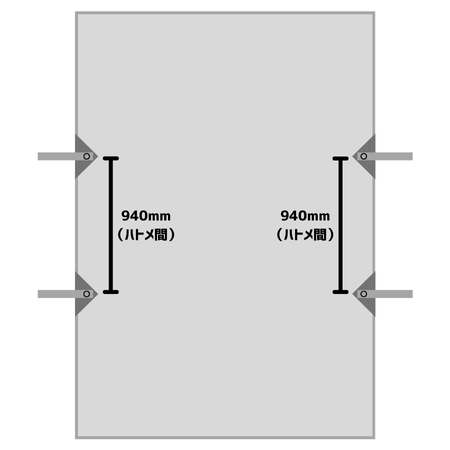 長辺中央にハトメ間隔940mmで、両側とも(計4か所)ハトメ+ループを追加加工。