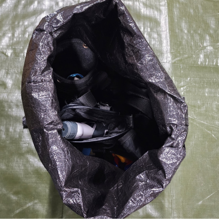ペグやハンマー、トングなど鋭利なギアのまとめ袋に